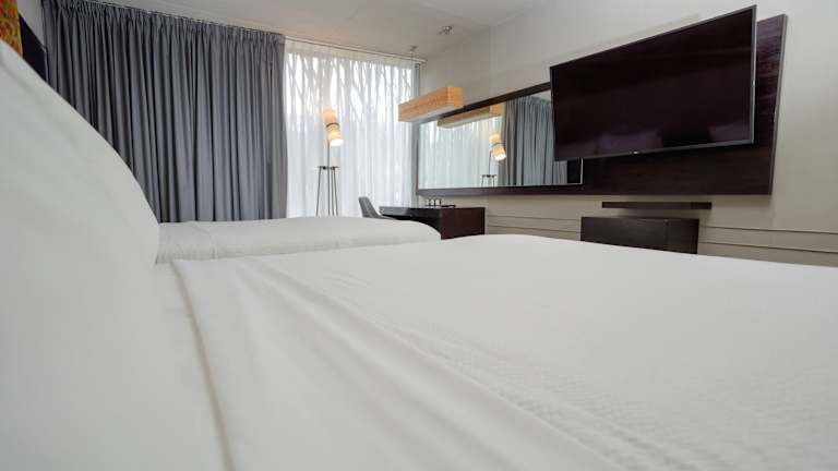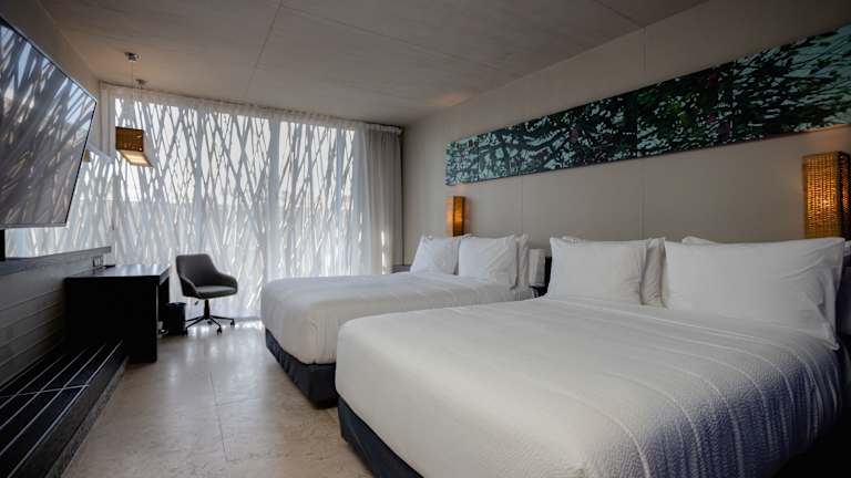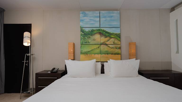 Die Zimmer sind mit Klimaanlage, Flachbildschirmfernseher, Kaffeemaschine, Schreibtisch, Safe und Minikühlschrank ausgestattet. Die Badezimmer verfügen über eine Dusche und Pflegeprodukte. Die Gäste können den Poolblick von Balkon oder Terrasse genießen, und es sind sowohl Nichtraucher- als auch Familienzimmer verfügbar.