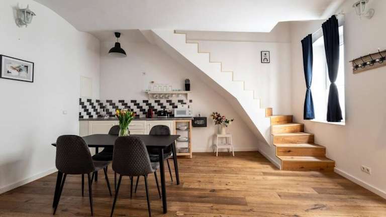 HM • Cozy 1BR Duplex Near Center ist eine Ferienwohnung, die Übernachtungsmöglichkeiten in einem Duplex-Stil bietet. Die Unterkunft hat ein separates Schlafzimmer, ein Badezimmer und ein Wohnzimmer. Es wird kostenfreies WLAN angeboten.