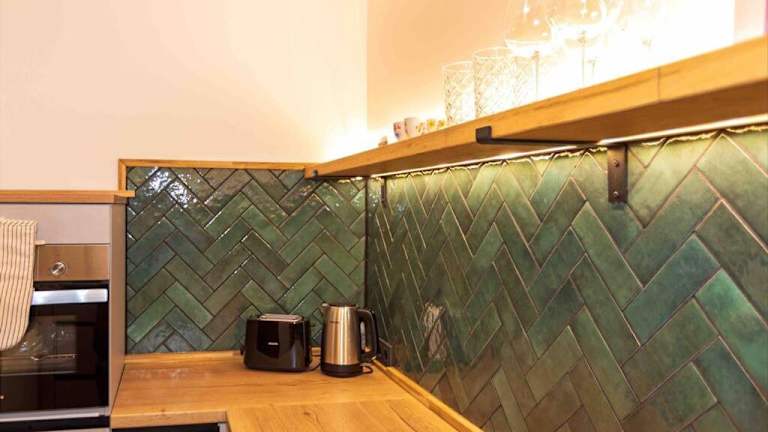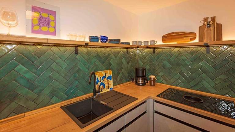 Die Ferienwohnung umfasst ein Schlafzimmer, ein Wohnzimmer, eine gut ausgestattete Küche mit Kühlschrank und Geschirrspüler sowie eine Veranda und einen Balkon. Handtücher und Bettwäsche werden bereitgestellt.
