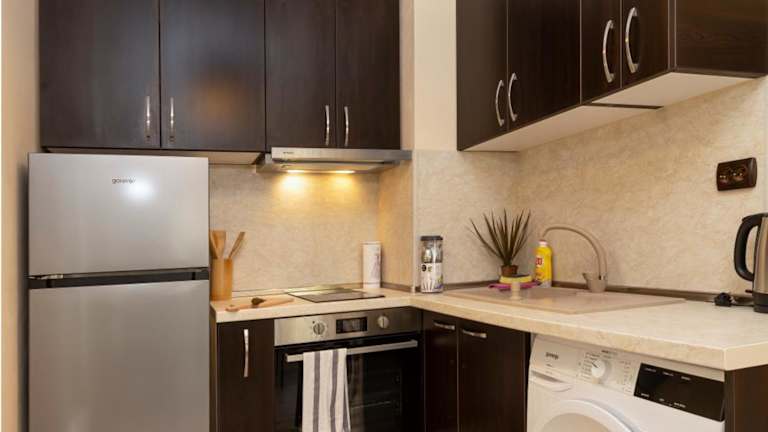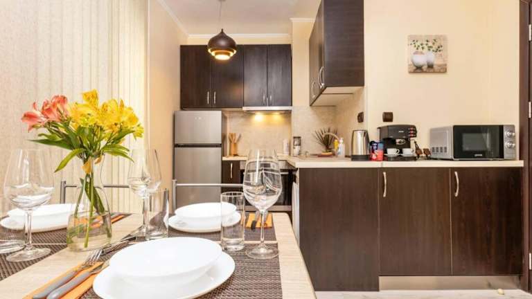 Das Apartment verfügt über eine voll ausgestattete Küche, in der die Gäste ihre eigenen Mahlzeiten zubereiten können. Alternativ gibt es in der Umgebung verschiedene Restaurants und Cafés, in denen die Gäste lokale und internationale Küche genießen können.