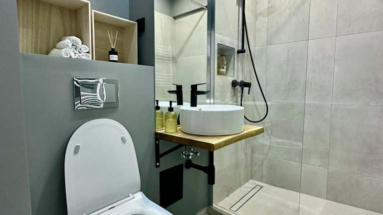 Die Ferienwohnung verfügt über 1 Schlafzimmer, eine moderne Küche, einen Flachbild-TV, einen Sitzbereich und ein Badezimmer mit Dusche.