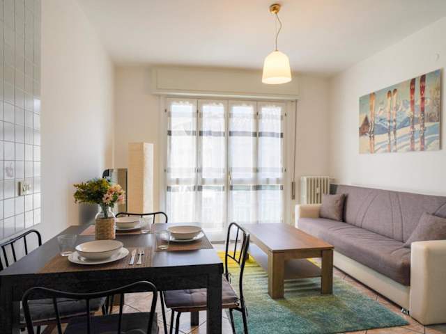 Die Ferienwohnung umfasst zwei Schlafzimmer, ein Wohnzimmer, einen Flachbild-TV sowie eine gut ausgestattete Küche. Des Weiteren stehen ein Badezimmer mit Bidet und Dusche sowie Balkon mit Bergblick zur Verfügung. Bettwäsche und Handtücher sind vorhanden, und die Unterkunft wird gemäß den Vorgaben der örtlichen Behörden gewaschen.
