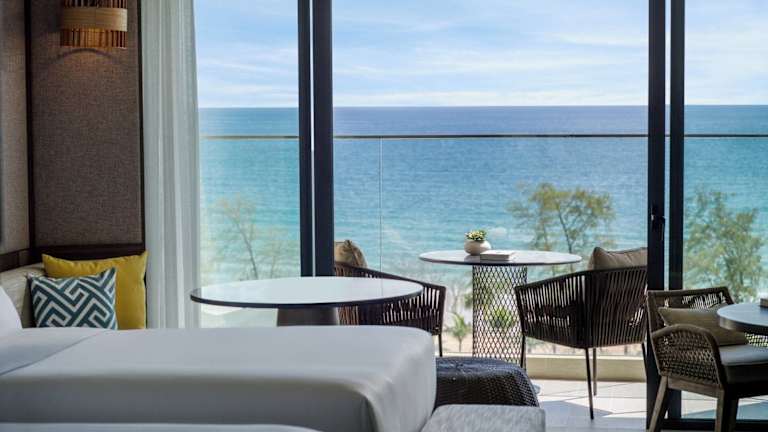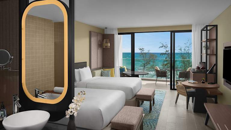 Die klimatisierten Zimmer sind ausgestattet mit einem Balkon oder einer privaten Terrasse, einem Safe, einer Minibar, einem Kühlschrank, einer Kaffeemaschine, einem Schreibtisch sowie einem Flachbild-TV. Jedes Zimmer verfügt über ein Badezimmer mit Dusche, Haartrockner und Bademänteln. Es stehen auch rollstuhlgerechte Zimmer zur Verfügung.