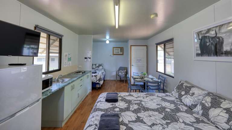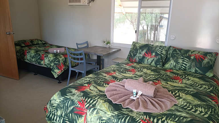 Der Cunnamulla Tourist Park bietet komfortable Zimmer mit allen Annehmlichkeiten, die Sie für einen angenehmen Aufenthalt benötigen. Die klimatisierten Zimmer verfügen über eine voll ausgestattete Küche mit Essbereich, in der Sie Ihre eigenen Mahlzeiten zubereiten können. Entspannen Sie sich im Wohnbereich und genießen Sie Ihre Lieblingssendungen auf dem Flachbild-TV. Das private Badezimmer ist mit einer Dusche, kostenfreien Pflegeprodukten und einem Haartrockner ausgestattet. Ein Kühlschrank, eine Mikrowelle, ein Kochfeld und ein Wasserkocher sind ebenfalls vorhanden.