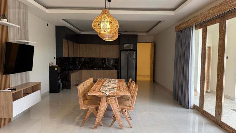 Die Villa umfasst drei Schlafzimmer, ein Wohnzimmer mit Flachbild-TV und eine gut ausgestattete Küche mit Kühlschrank und Herdplatte. Außerdem stehen insgesamt drei Badezimmer mit Dusche zur Verfügung. Die Gäste finden zudem Annehmlichkeiten wie Klimaanlage und Zugang zu einer Gemeinschaftsküche vor.
