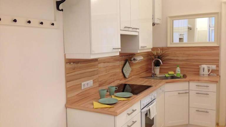 Jede Wohneinheit ist mit einer voll ausgestatteten Küche versehen, die einen Kühlschrank, einen Geschirrspüler, einen Ofen, eine Herdplatte, einen Toaster, eine Kaffeemaschine und einen Wasserkocher umfasst.