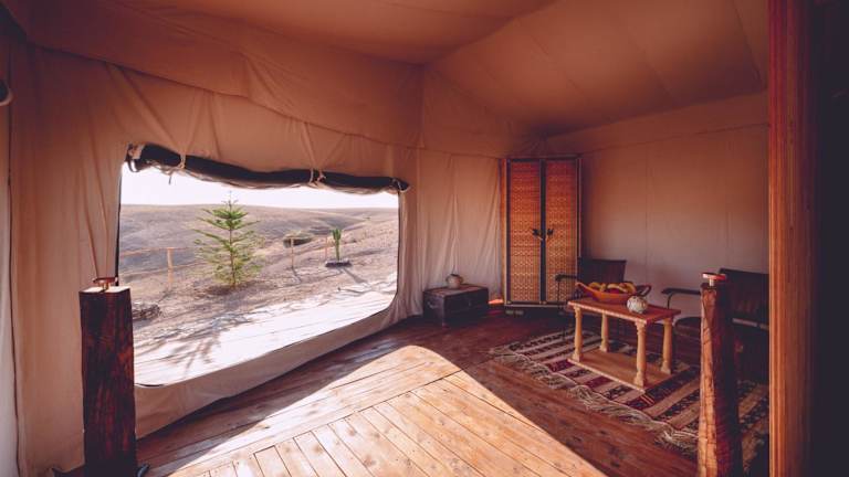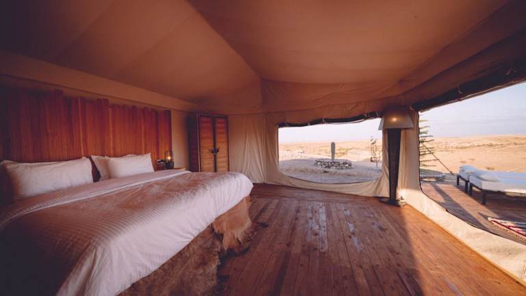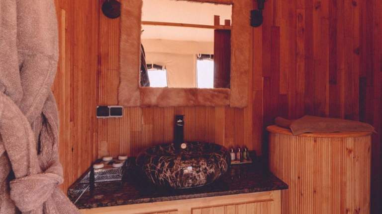In diesem luxuriösen Zelt werden Handtücher und Bettwäsche gestellt. Genießen Sie den Komfort und die Annehmlichkeiten dieses einzigartigen Zelts, das eine gemütliche und luxuriöse Atmosphäre bietet.