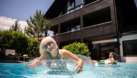 Ein bisschen SPA muss sein Treten Sie ein in unseren Wellness-Garten. Schwitzen Sie bei 85 °in unserer finnischen Sauna. Stärken Sie Ihre Abwehrkräfte und entspannen Sie Ihre Muskulatur. Wenn Sie es sanfter lieben, genießen Sie die Bio-Sauna mit Kräuterdampf bei 55 °. Erfrischung bringt eine Abreibung am Eisbrunnen. Unser neues Heu SPA birgt mit Heu-Sauna und Heudampfbad das ganz besondere Allgäu Feeling. Und dann ab in unseren ganzjährig beheizten Outdoorpool mit Blick auf Schattenberg und Nebelhorn. Und auf bunte Gleitschirmflieger. Wohlig temperiert. Und mit bestem Oberstdorfer Quellwasser gefüllt. Mit der Güte von Mineralwasser. Das spürt man gleich - beim Eintauchen und Abtauchen in unserem Pool.