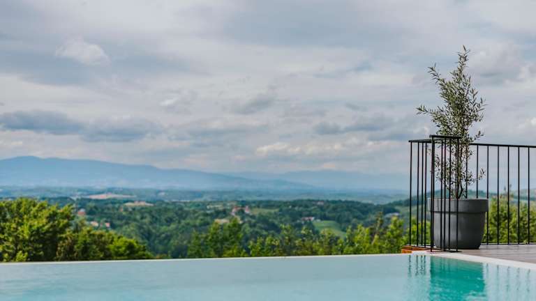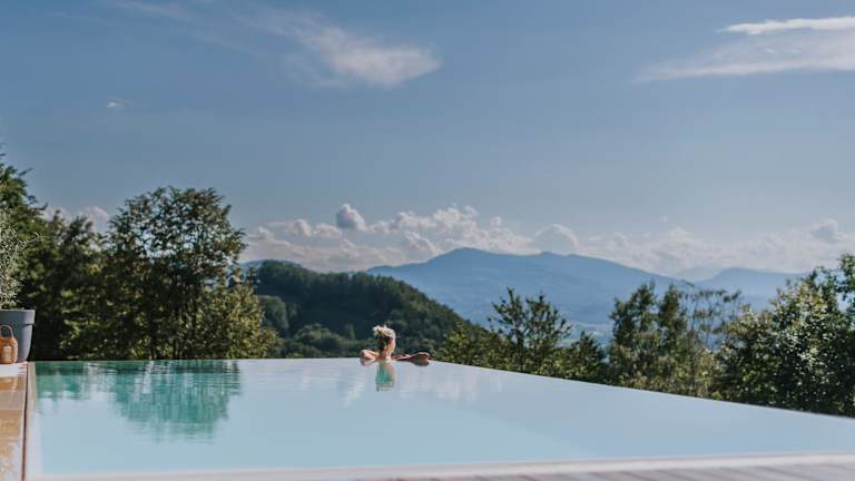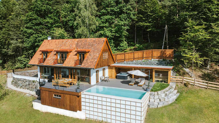 Die Unterkunft befindet sich in Sankt Johann im Saggautal, umgeben von einer malerischen Landschaft mit Blick auf die Berge und den Pool.