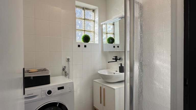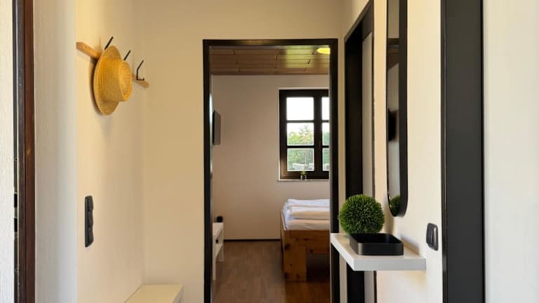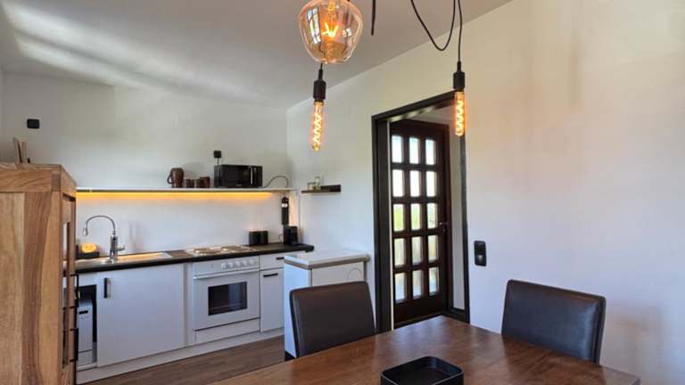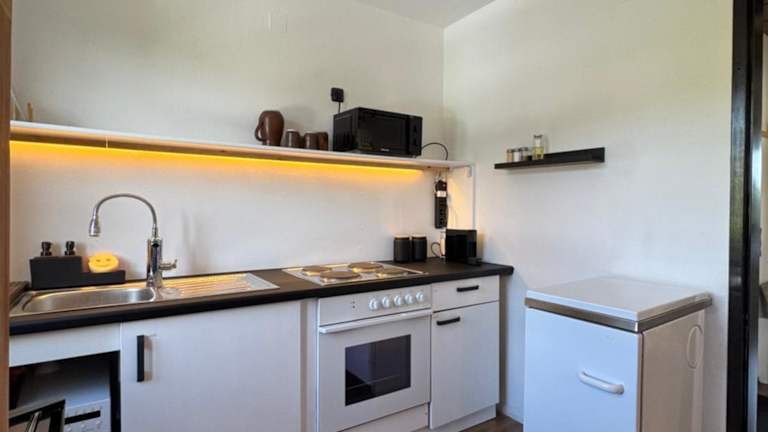 Die Ferienwohnung besteht aus einem Schlafzimmer, einem Flachbild-TV, einer gut ausgestatteten Küchenzeile mit einem Kühlschrank und Geschirrspüler sowie einem Badezimmer mit Dusche. Die Unterkunft ist haustierfreundlich und bietet Annehmlichkeiten wie Heizung und Gartenmöbel.