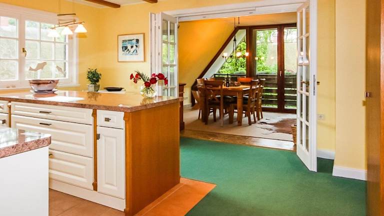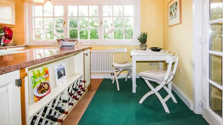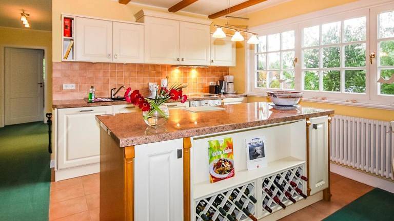 Die Ferienwohnung enthält eine voll ausgestattete Küche, die mit einem Kühlschrank, Geschirrspüler, einer Waschmaschine, einem Ofen und einer Mikrowelle ausgestattet ist.
