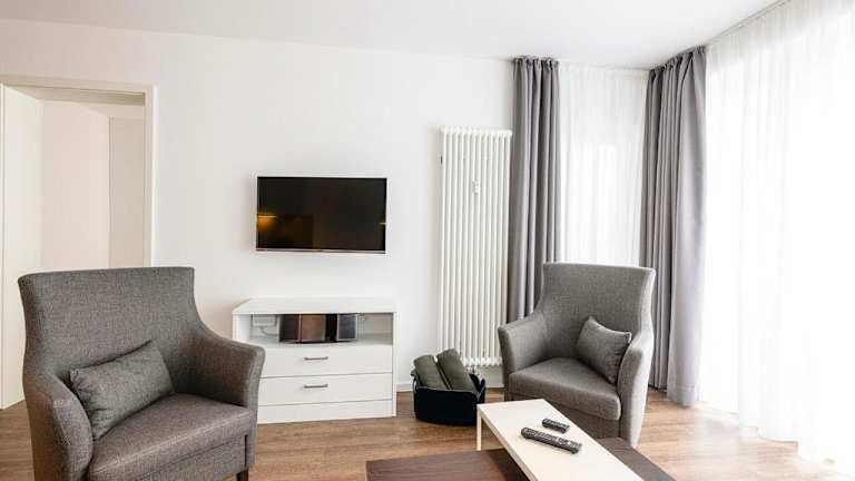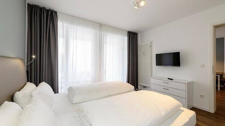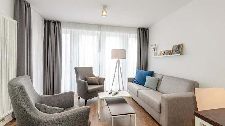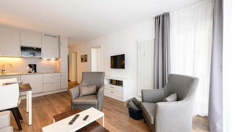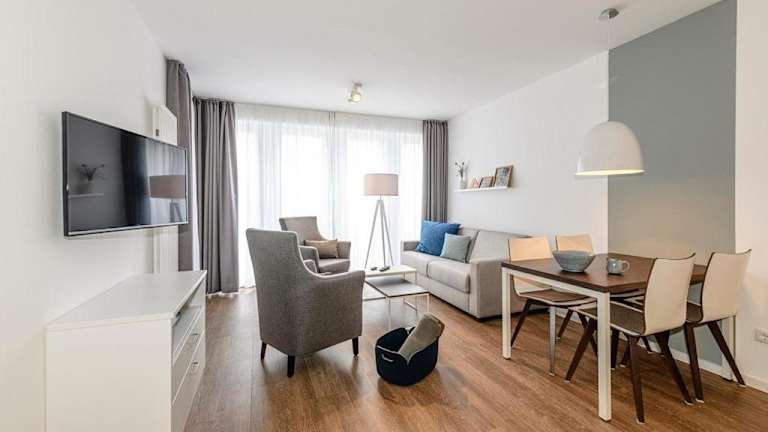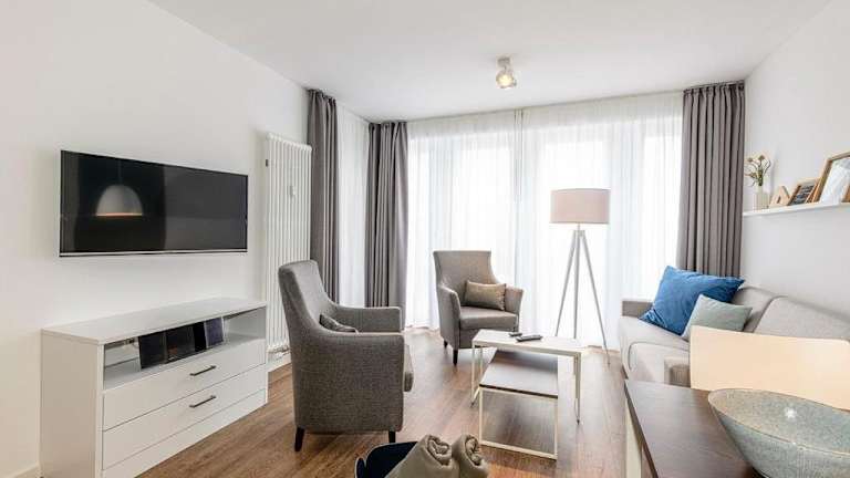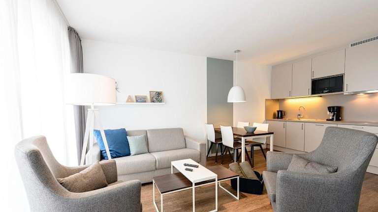 Die Ferienwohnung verfügt über zwei Schlafzimmer, ein Wohnzimmer sowie eine gut ausgestattete Küche, die einen Kühlschrank und Geschirrspüler umfasst. Ein Balkon ist ebenfalls vorhanden. Handtücher und Bettwäsche können gegen Aufpreis hinzugebucht werden oder selbst mitgebracht werden.