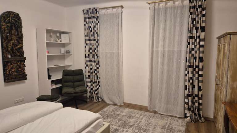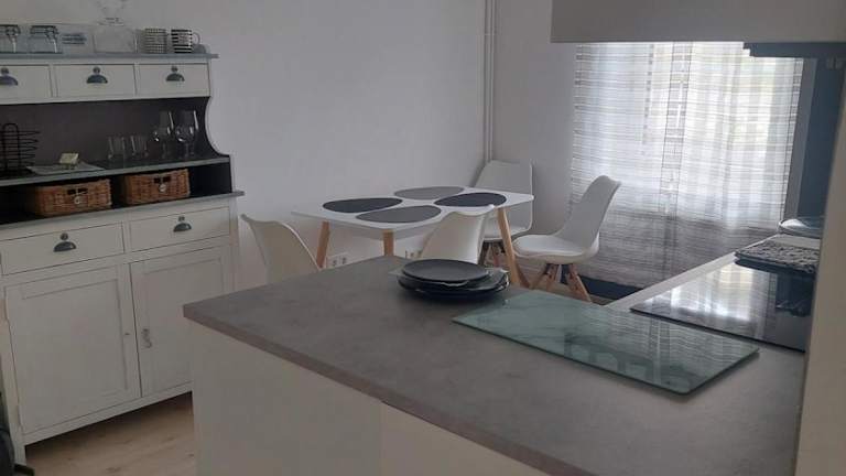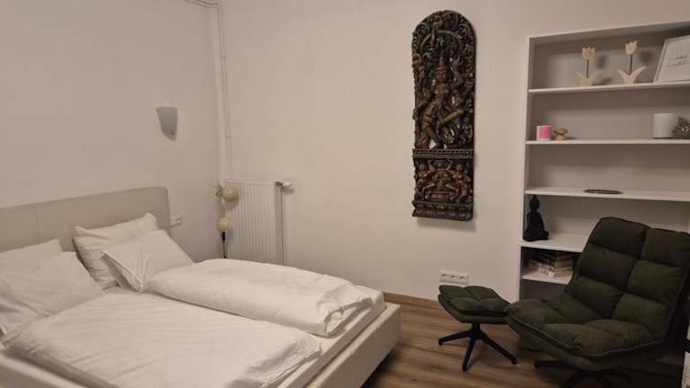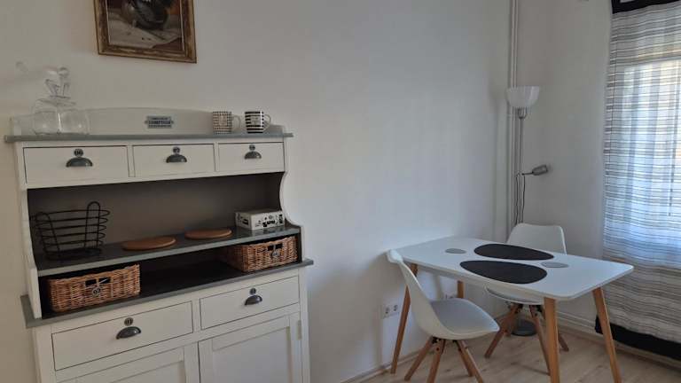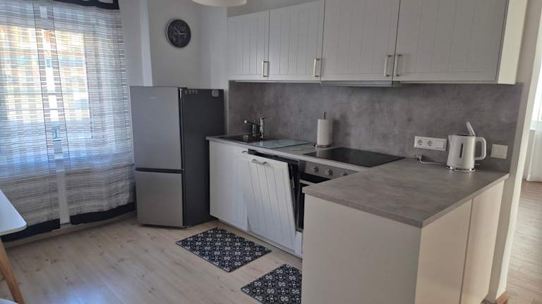 Die Ferienwohnung beinhaltet 1 Schlafzimmer, eine Küche mit Kühlschrank und Geschirrspüler sowie ein Badezimmer mit Dusche, Haartrockner und Waschmaschine. Bettwäsche und Handtücher werden bereitgestellt.