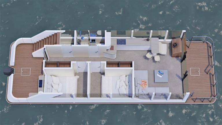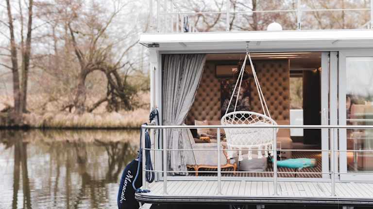 Das Hausboot umfasst zwei Schlafzimmer, ein Wohnzimmer und ein Badezimmer mit Dusche und Haartrockner. Zur Ausstattung gehören zudem ein Kühlschrank, eine Kaffeemaschine sowie Handtücher und Bettwäsche.