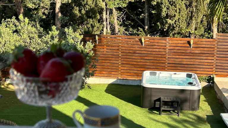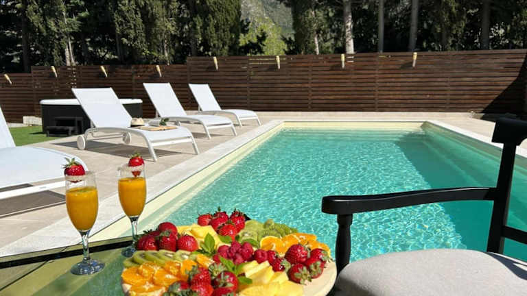 Die Unterkunft Delux with private pool bietet Übernachtungsmöglichkeiten mit einem Balkon und Gartenblick. Das Ferienhaus verfügt über einen eigenen Pool, einen Garten und eine Terrasse mit Bergblick. Es ist geeignet für einen entspannenden Aufenthalt.