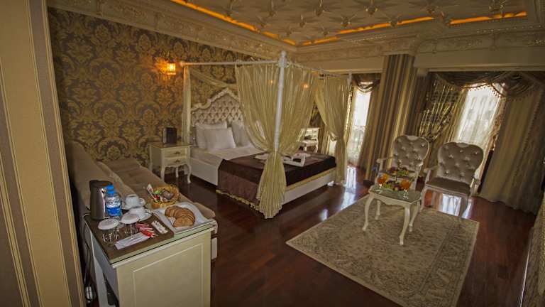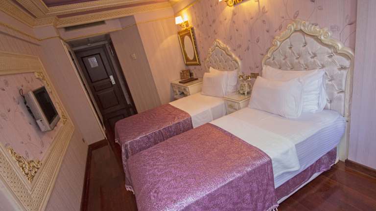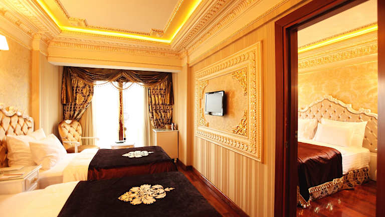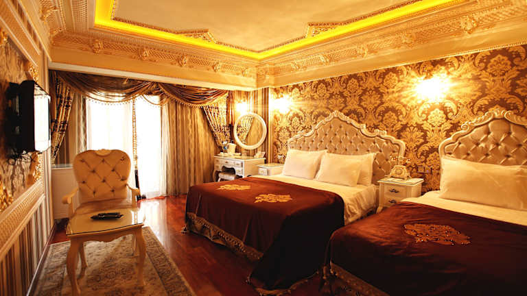 Das Deluxe Golden Horn Sultanahmet Hotel bietet geräumige und elegant eingerichtete Zimmer im osmanischen Stil. Jedes Zimmer ist mit luxuriösen Möbeln ausgestattet und verfügt über Annehmlichkeiten wie kostenloses WLAN, Sat-TV und doppelt verglaste Fenster. Die Zimmer bieten entweder einen Blick auf den Garten oder den Park. Einige Zimmer bieten auch einen atemberaubenden Blick auf das Meer, den Topkapi-Palast, die Blaue Moschee oder die Hagia Sophia.