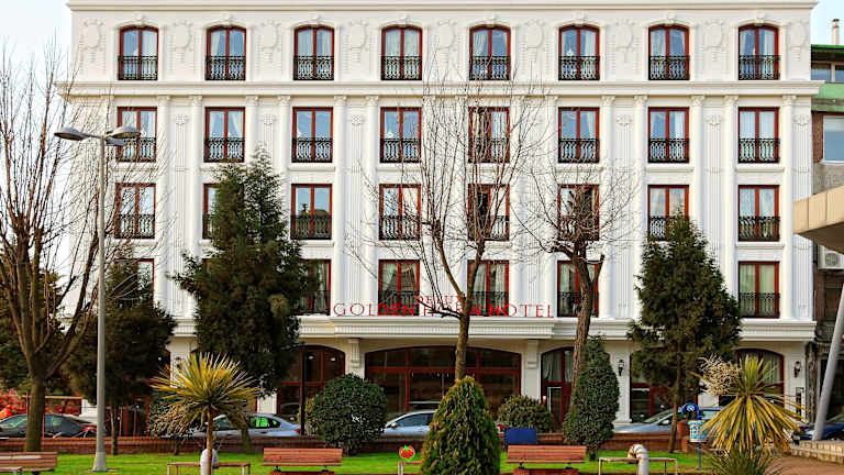 Das Deluxe Golden Horn Sultanahmet Hotel ist ein luxuriöses Hotel in zentraler Lage in Sultanahmet, das einen komfortablen Aufenthalt in einem eleganten osmanischen Ambiente bietet. Von hier aus können Sie bequem zu Fuß historische Sehenswürdigkeiten wie die Hagia Sophia und die Blaue Moschee erreichen. Das Hotel besticht mit einem atemberaubenden Blick auf das Marmarameer und die Skyline von Istanbul von seinem Frühstücksraum und der Restaurantterrasse aus. Die Zimmer sind geräumig und elegant, mit luxuriösen Möbeln ausgestattet und bieten kostenfreies WLAN sowie Sat-TV. Sie haben die Wahl zwischen Zimmern mit Garten- oder Parkblick, einigen bieten sogar Meerblick oder Blick auf den Topkapi-Palast, die Blaue Moschee oder die Hagia Sophia. Das Hotel bietet auch eine 24-Stunden-Rezeption, einen Autovermietungsservice und touristische Informationen über berühmte Sehenswürdigkeiten in der Nähe. Kostenlose Parkplätze stehen zur Verfügung.
