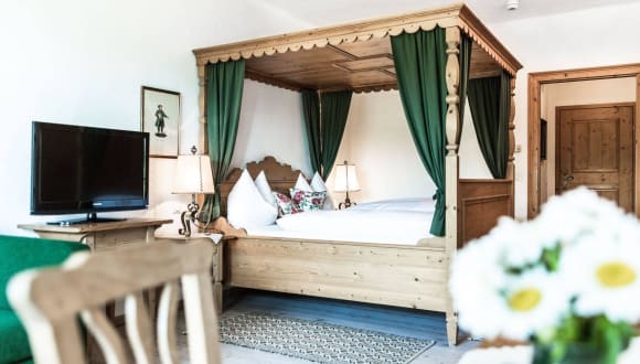 Liebevolle Details! Knarrende Lärchenholzböden, handgewebte Schafwollteppiche, Vollholzmöbel vom Eugendorfer Tischler, Vorhänge aus Altsalzburger Handdrucken, handgeschmiedete Messinglampen, alte Bauernmöbel … der Holznerwirt hat so manches versteckte Highlight parat.