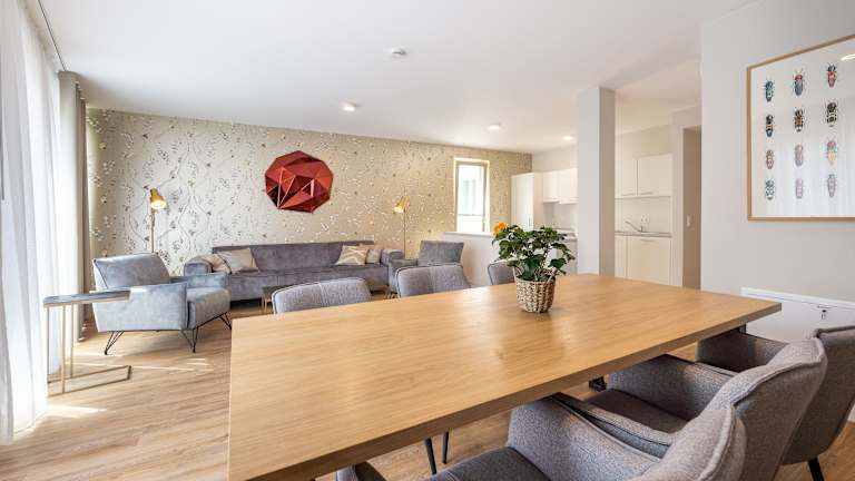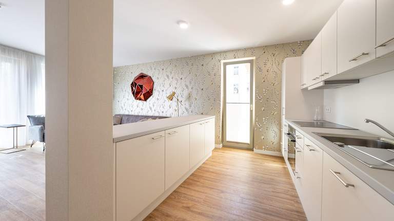 Es besteht die Möglichkeit der Essenslieferung in die Unterkunft. Des Weiteren sind die Wohnungen mit Küchen ausgestattet, die unter anderem über Kühlschrank, Herdplatte und Kaffeemaschine verfügen.