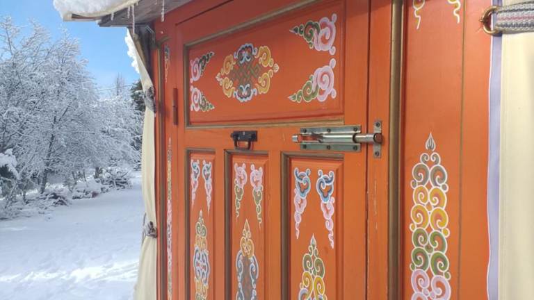 Die Jurte im Destination Ailleurs bietet einen komfortablen Aufenthalt mit einem Esstisch und einem eigenen Badezimmer mit Dusche. Genießen Sie den Bergblick und nutzen Sie den Sitzbereich im Freien für zusätzlichen Komfort.