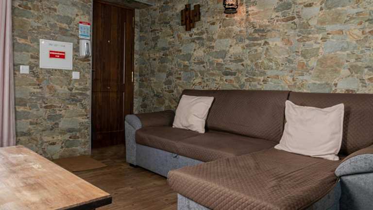 Das Ferienhaus umfasst ein Wohnzimmer mit einem Sitz- und Essbereich, ein Schlafzimmer sowie zwei Badezimmer mit Bidet und Dusche. Es werden Handtücher und Bettwäsche zur Verfügung gestellt.