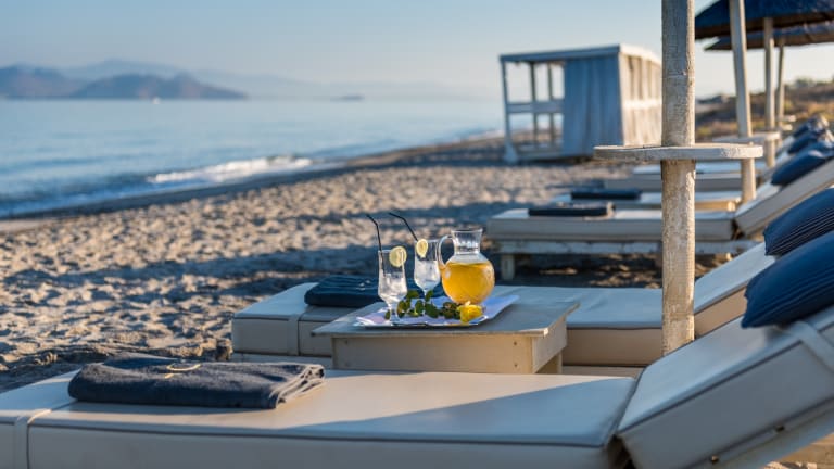 Diamond Deluxe Hotel is situated in one of the most ideal locations on the island of Kos, just 50m from the sandy beach of Lambi, 4km from Kos Town Centre and 24km from Hippocrates Airport. The naturally inspired architecture harmoniously blends with minimal glamour, radiating a luxuriously chic aesthetic, both internally and externally. Our rooms are handsome spaces of comfortable proportion, all with sweeping views of the gardens, pool or sea. State of the art facilities and exclusive, unsurpassed service create an idyllic haven of sensual and modern sensibility. Each of the 110 rooms and suites exude an air of elegance and charm. Masterfully conceived and meticulously designed, the resort is truly a breathtaking abode nestled in endless blue. Surround yourself in style, whilst indulging in tranquility and gracious service. During your stay, Emerald, our main restaurant serves a lavish American buffet breakfast, as well as a local 5 course a la carte dinner, for our half-board guests. Peruzzi, our A la Carte Restaurant, (not inclusive of half-board), serves gourmet Mediterranean cuisine on its large open-air terrace, overlooking the clear waters of The Aegean Sea. For a light meal, the pool bar offers a wide range of snacks to recharge your batteries, whilst swimming in the pool. Attentive service runs right down to the pristine white sands of our private beach. In the evening, slip onto an inviting sofa and savor an after dinner cocktail, while enjoying the nightly entertainment. The Mazarin Health Club and Spa, renowned for its wellness philosophy, offers a customized range of spa treatments in an ambient, zen atmosphere. For the fitness conscious, daily yoga and exercise programs are the way to start off your day. Or perhaps enjoy a game of tennis or basketball.
