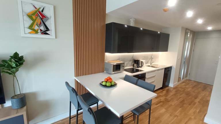 Die Ferienwohnung besteht aus einem Schlafzimmer und einem Wohnzimmer. Sie verfügt über eine voll ausgestattete Küche mit Kühlschrank und Kaffeemaschine. Zur weiteren Ausstattung zählen ein Badezimmer mit Bidet und Dusche sowie Handtücher und Bettwäsche.