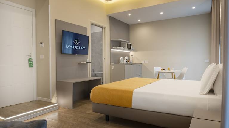 Die klimatisierten Zimmer im DIMORA DUOMO sind komfortabel eingerichtet und bieten alles, was Sie für einen angenehmen Aufenthalt benötigen. Zur Ausstattung gehören ein Schreibtisch, eine Kaffeemaschine, ein Kühlschrank, eine Minibar, ein Safe, ein Flachbild-TV, ein Balkon und ein eigenes Bad mit einem Bidet. Einige Zimmer verfügen auch über eine voll ausgestattete Küche mit einer Mikrowelle und einem Kochfeld. Bettwäsche und Handtücher werden gestellt.