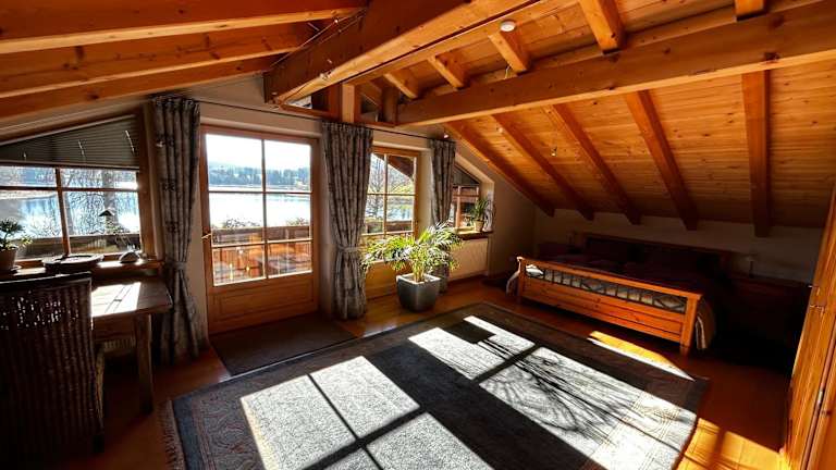 Direkt am See mit Bergblick bietet Übernachtungsmöglichkeiten direkt am Strand mit Blick auf die umliegenden Berge. Es handelt sich hierbei um eine Ferienwohnung, die einen Garten, ein Restaurant und kostenfreies WLAN bereitstellt. Check-in ist zwischen 15:00 und 21:00 Uhr möglich, der Check-out erfolgt zwischen 08:00 und 11:00 Uhr. Es wird darauf hingewiesen, dass keine Feiern erlaubt sind und der Mindestalter für den Check-in bei 18 Jahren liegt.