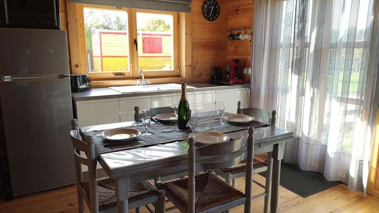 Das Chalet ist mit einer voll ausgestatteten Küche ausgestattet. Diese beinhaltet einen Kühlschrank, einen Ofen, eine Mikrowelle, eine Kaffeemaschine sowie einen Wasserkocher. Vor Ort steht eine Terrasse zur Verfügung, die zum Verweilen einlädt.