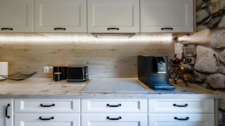 Das Ferienhaus verfügt über eine Gemeinschaftsküche, in der Gäste ihre Mahlzeiten zubereiten können. Der Essbereich ermöglicht gesellige Zusammenkünfte.