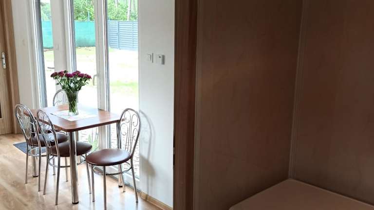 Die klimatisierten Unterkünfte im Domki pod Sosnami bieten eine gemütliche und komfortable Atmosphäre. Genießen Sie den Blick auf den Garten von der Terrasse aus und entspannen Sie sich im geräumigen Sitzbereich. Die voll ausgestattete Küchenzeile bietet alle Annehmlichkeiten, die Sie benötigen, um Ihre eigenen Mahlzeiten zuzubereiten, und das private Badezimmer verfügt über eine Dusche und einen Haartrockner.