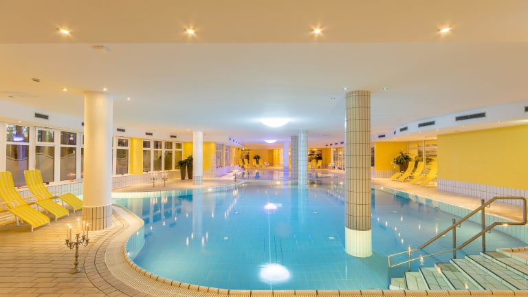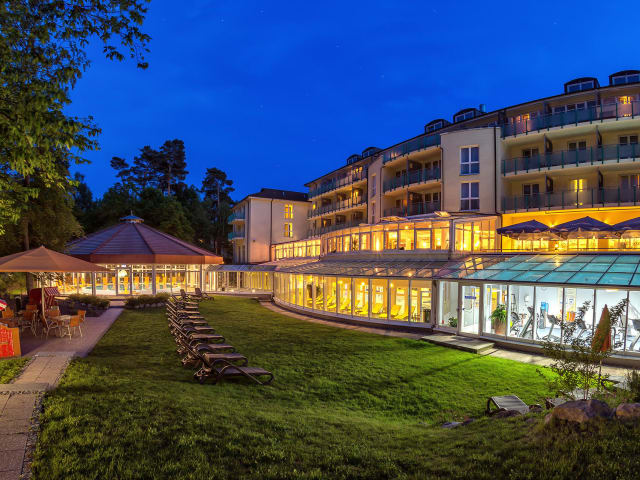 Badekultur zelebrieren. Vom Wasser getragen werden, fast wie im Toten Meer ... Das Seehotel BINZ-THERME Rügen beherbergt einen an der Ostseeküste einmaligen Schatz: drei Thermalbecken gefüllt mit heilkräftiger Thermal-Jodsole aus 300 bis 1.222 Metern Tiefe, sagenhafte 220 Millionen Jahre alt und wohlige 32°C bis 34°C warm. Die Thermal-Sole-Badelandschaft, die Saunawelt und der Fitnessraum stehen unseren Hausgästen kostenfrei als Orte der Ruhe, Entspannung und Erholung zur Verfügung. Kinder nehmen bitte nur mit Aufsicht am Bade- und Saunabetrieb teil. Aqua-Gymnastik (tgl.) und Nordic Walking-Treff am Strand (Mo-Fr) inklusive, wechselndes Kursangebot (Step-Aerobic, Rücken-Fitness, Bauch-Beine-Po, Kreistraining, Entspannung & Meditation) und Nordic Walking-Kurse gegen Gebühr.