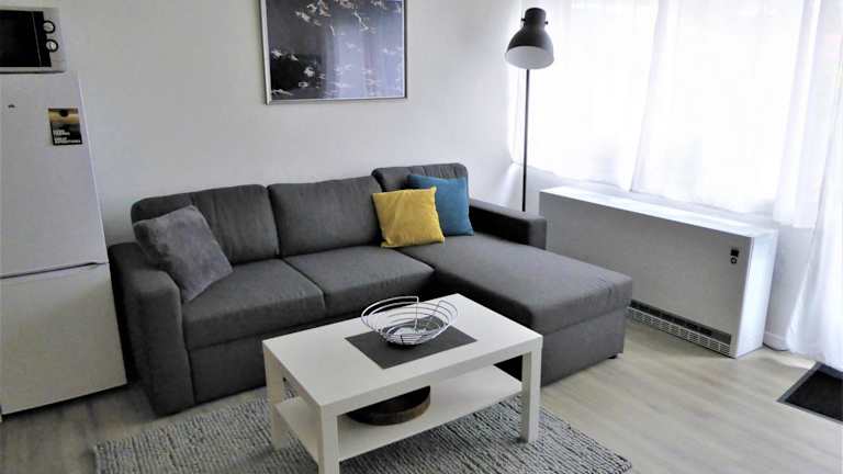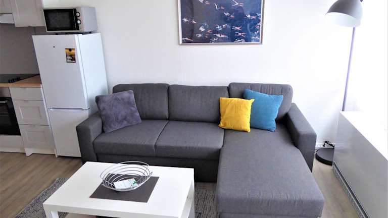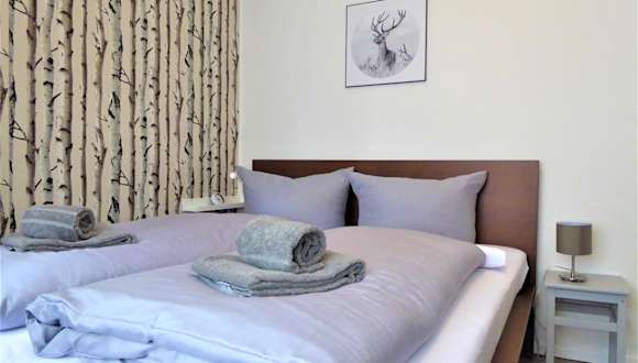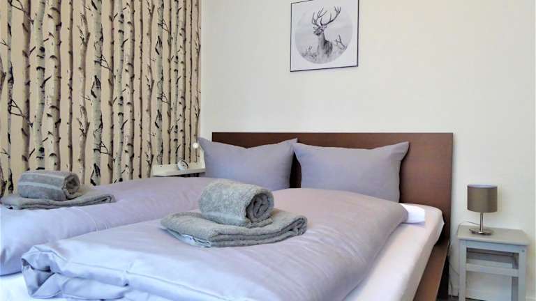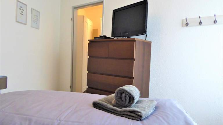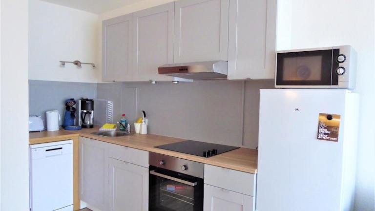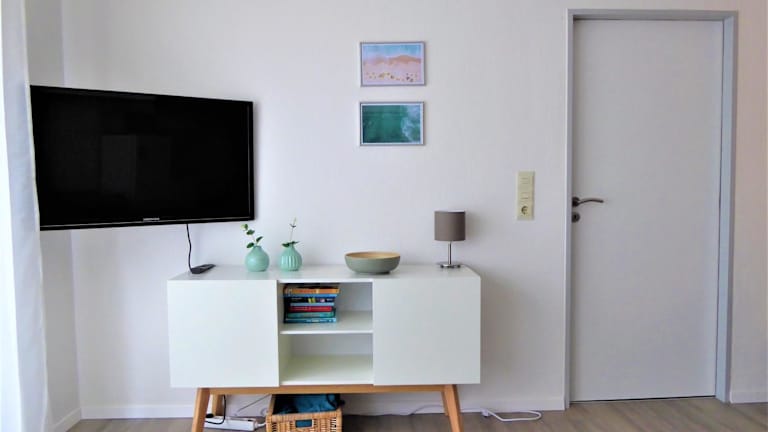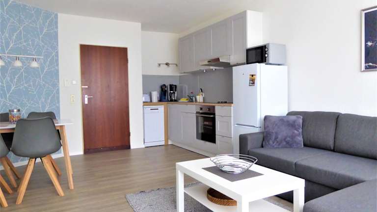 Die Ferienwohnung umfasst ein Schlafzimmer, eine gut ausgestattete Küche mit Kühlschrank und Geschirrspüler, ein Wohnzimmer sowie einen Flachbild-TV. Handtücher und Bettwäsche werden bereitgestellt.