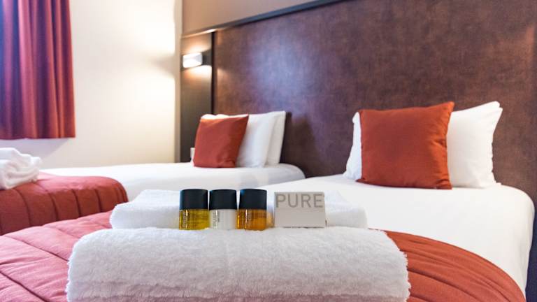 Die Zimmer sind mit Teppichböden ausgestattet und verfügen über Doppel- oder Queensize-Betten. Jedes Zimmer bietet ein eigenes Bad mit Dusche und Badewanne sowie kostenloses WLAN. Zu den Einrichtungen gehören ein 43-Zoll-Flachbild-TV, ein Schreibtisch mit Stuhl, Teezubereitungszubehör, ein Safe, ein Telefon und ein Radio. Auf Anfrage sind Zustellbetten verfügbar. Es gibt Nichtraucher- sowie rollstuhlgerechte Zimmer.