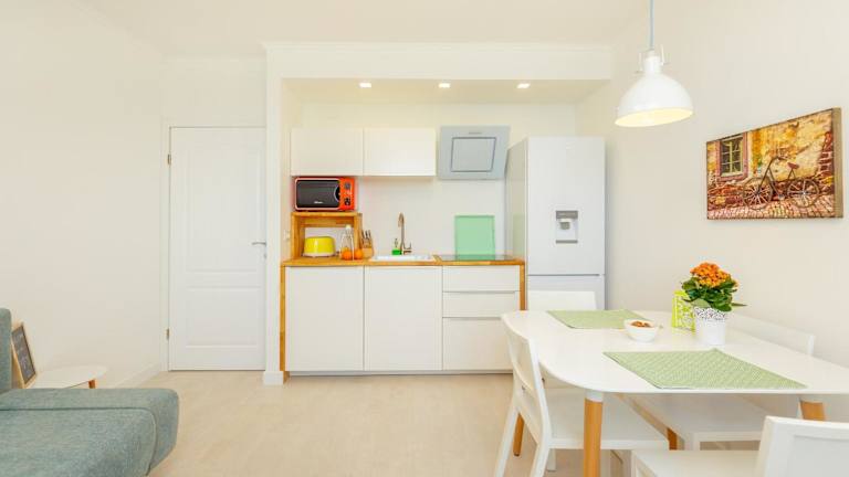 Das Apartment bietet ein Schlafzimmer, ein Wohnzimmer, eine voll ausgestattete Küche mit Kühlschrank und Kaffeemaschine sowie ein Badezimmer mit Badewanne und Haartrockner.