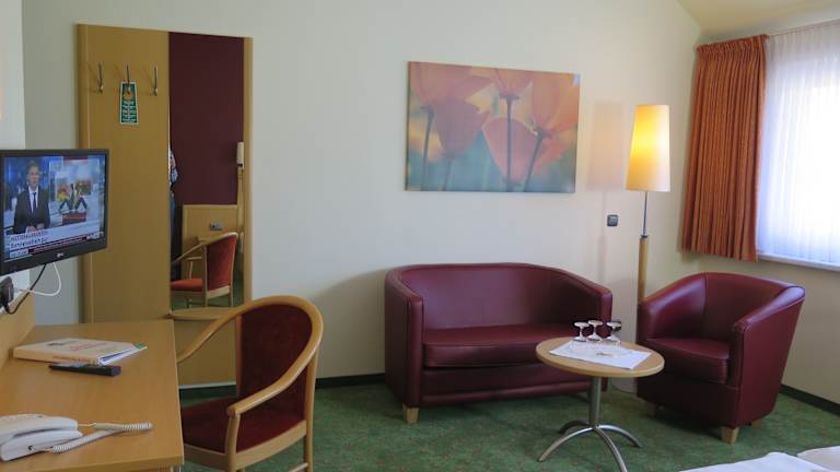 Unsere Einzelzimmer sind 14 bis 16 qm groß und unsere Doppelzimmer zwischen 20 und 28 qm groß. Zur Grundausstattung in allen Zimmern gehört Dusche/WC, Haartrockner, SAT-Flat-TV (41 Fernseh- und 70 Radio-Programme), Safe und WLAN. Allen Gästen steht ein SB-Kühlschrank mit preiswerten Getränken zur Verfügung. Für gästeeigene Fahrräder und Pedelecs gibt es eine Fahrradgarage mit Stromanschluß.