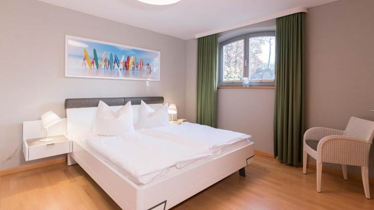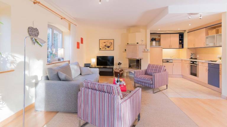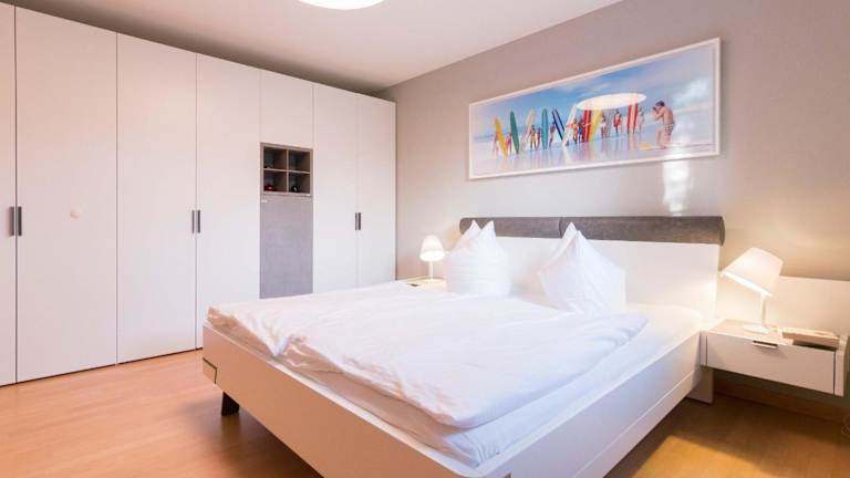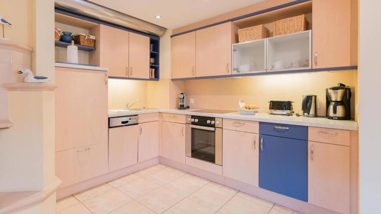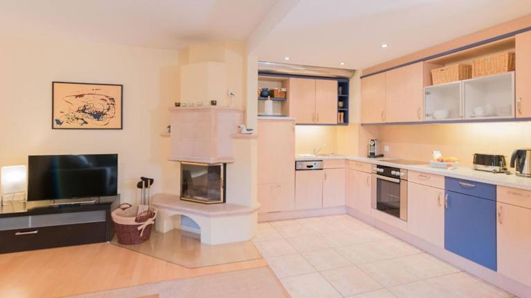 Die Wohnung umfasst 1 Schlafzimmer, ein Wohnzimmer sowie ein Badezimmer mit Dusche. Für die Selbstverpflegung steht eine gut ausgestattete Küche zur Verfügung, die mit einem Kühlschrank und einem Geschirrspüler ausgestattet ist. Ein TV ist ebenfalls vorhanden. Bettwäsche und Handtücher sind nicht im Preis inbegriffen und können entweder selbst mitgebracht oder gegen Gebühr vor Ort gemietet werden.
