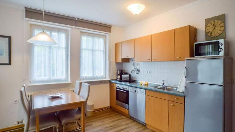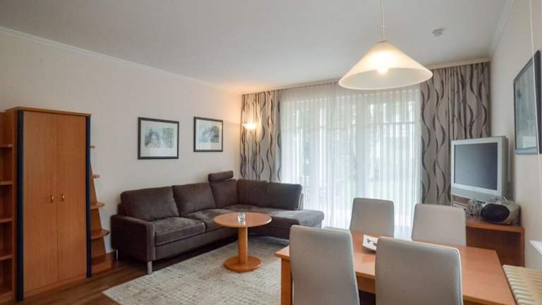 Dünenpark Binz - Komfort Ferienwohnung mit 1 Schlafzimmer und Terrasse im Erdgeschoss 219 bietet eine komfortable Ferienunterkunft mit einer Terrasse. Die Unterkunft ist vollständig ausgestattet mit einem Schlafzimmer, einem Wohnzimmer und einer gut ausgestatteten Küche. Es wird kostenloses WLAN angeboten, zudem ist ein Privatparkplatz vor Ort verfügbar. Objektspezifische Regeln schließen Junggesellen- oder Junggesellinnenabschiede sowie ähnliche Feiern aus.