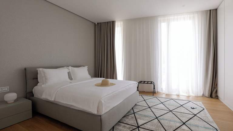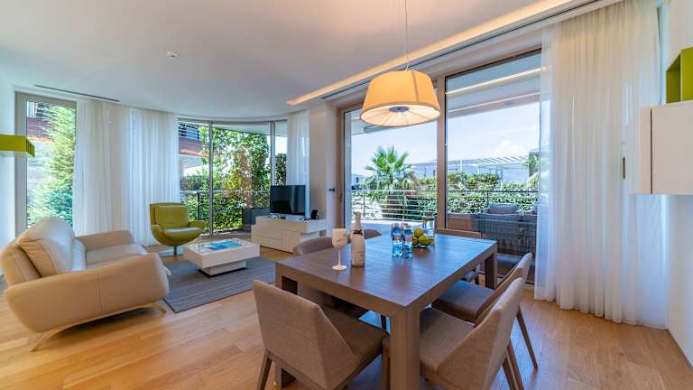 Die Zimmer sind mit einem Wohnbereich, einer Küche und einem Badezimmer ausgestattet. Alle Apartments verfügen über eine Klimaanlage, einen Balkon oder eine Terrasse mit Meerblick, Teppichboden, ein Doppelbett oder Queensize-Bett sowie separate Schlafzimmer. Zur Ausstattung gehören ein Safe, ein Schreibtisch, eine Minibar gegen Gebühr, Kühlschrank, Tee-/Kaffeemaschine und Geschirrspüler. Die Badezimmer sind mit Dusche, Badewanne und Whirlwanne ausgestattet.