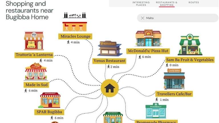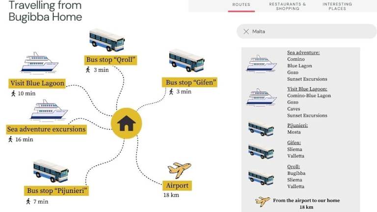 Die Unterkunft befindet sich in der Nähe des Meeres, nur 200 Meter von der Küste und dem zentralen Platz entfernt. In der Umgebung sind mehrere Strände erreichbar, wie der Buggiba Perched Beach in 600 Metern Entfernung, sowie die Tax-Xama-Bucht und der Qawra Point, beide jeweils etwa 1,8 km entfernt. Das Malta National Aquarium ist mit ca. 1,6 km ebenfalls gut erreichbar. Der Flughafen Malta liegt in einer Distanz von 16 km und es wird ein kostenpflichtiger Flughafentransfer angeboten.
