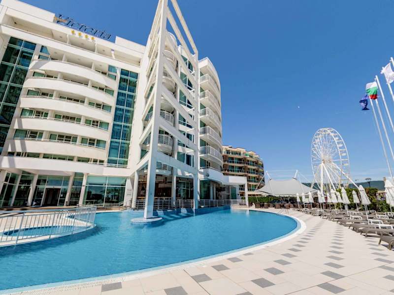 Das 4-Sternе Effect Grand Victoria Hotel befindet sich an der Strandpromenade des größten bulgarischen Badeortes Sonnenstrand. Einer der größten Vorteile ist der fantastische Meerblick und die Nähe zum Strand - nur 30 Meter vom Hotel entfernt. Das Zentrum des Ortes mit allen Restaurants, Bars, Geschäften und Sehenswürdigkeiten erreichen Sie zu Fuß in 10 Minuten. Das Hotel ist ca. 30 km vom internationalen Flughafen Burgas entfernt, es liegt ca. 40 km nördlich von Burgas und nur 5 km nördlich von der antiken Altstadt Nessebar (UNESCO-Weltkulturerbe).