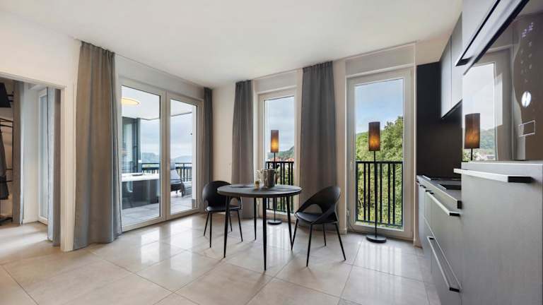 Die Ferienwohnung verfügt über ein Schlafzimmer und ein Badezimmer. Zur Ausstattung gehören Bettwäsche, Handtücher, ein Fernseher, eine voll ausgestattete Küche sowie ein Balkon mit Bergblick.