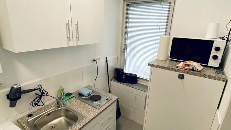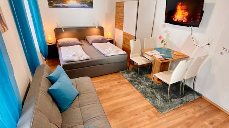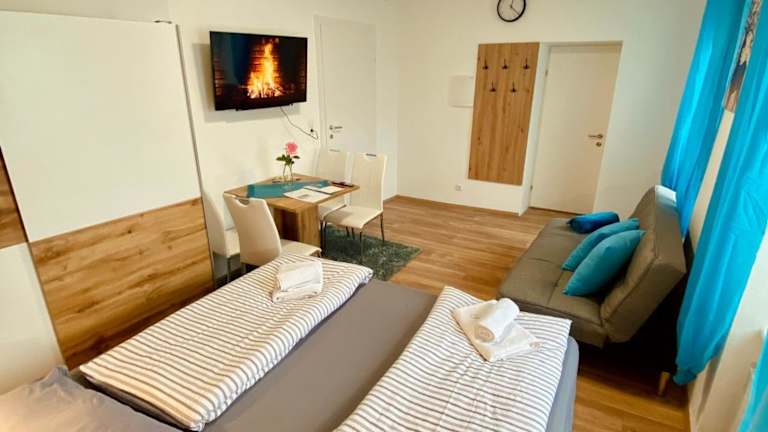 Das Einzimmer-Apartment umfasst 1 Schlafzimmer, eine komplett ausgestattete Küche mit Kühlschrank und Mikrowelle, einen Flachbild-TV sowie einen Sitzbereich. Das Badezimmer ist mit einer Badewanne oder Dusche ausgestattet. Handtücher und Bettwäsche werden bereitgestellt.