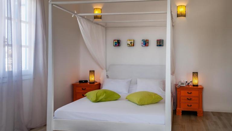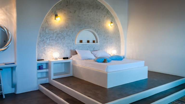 Die Zimmer und Suiten in den Eiriana Luxury Suites sind elegant und im typischen Kykladen-Stil gestaltet. Die weiß getünchten Wände verleihen den Räumen eine helle und luftige Atmosphäre. Jede Unterkunft verfügt über ein eingebautes Bett, einen Flachbild-Sat-TV, Klimaanlage und eine Minibar. Im eigenen Bad finden Sie eine Dusche, einen Haartrockner und Bademäntel vor. Einige Zimmer bieten zudem einen herrlichen Blick auf die Ägäis.