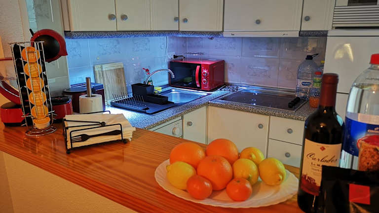 Die Ferienwohnung besteht aus einem Schlafzimmer, einem Wohnzimmer und einer voll ausgestatteten Küche mit Kühlschrank und Kaffeemaschine. Das Badezimmer ist mit einer Dusche und einem Haartrockner ausgestattet. Handtücher und Bettwäsche werden bereitgestellt. Die Unterkunft ist klimatisiert und verfügt über einen Balkon.