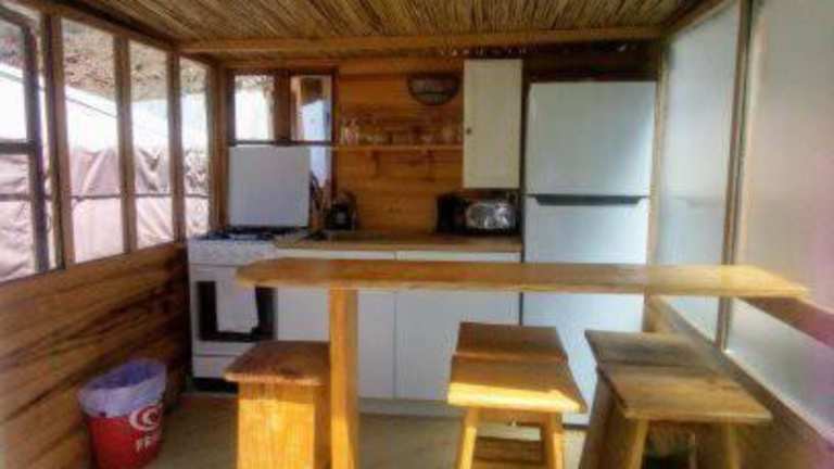 Die Zelt-Lodge umfasst 1 Schlafzimmer, ein Wohnzimmer sowie eine gut ausgestattete Küche mit Kühlschrank und Ofen. Ein Flachbild-TV sorgt für Unterhaltung, und das Badezimmer ist mit einer Dusche ausgestattet. Handtücher und Bettwäsche werden bereitgestellt.