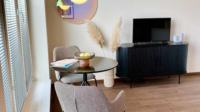 Die Wohnung verfügt über ein Schlafzimmer und ein Badezimmer. Zur Ausstattung gehören Bettwäsche, Handtücher, ein Flachbild-TV mit Satellitenkanälen, ein Essbereich sowie eine voll ausgestattete Küche. Ein Balkon mit Stadtblick ist ebenfalls vorhanden.