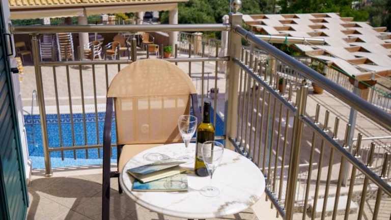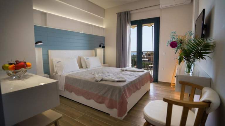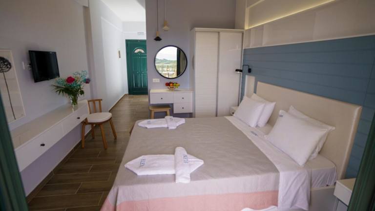 Die klimatisierten Wohneinheiten sind mit Fliesenböden, einem eigenen Badezimmer, einem Flachbild-TV, einem Kleiderschrank sowie einer ausgestatteten Küche ausgestattet. Jedes Zimmer verfügt über einen Balkon und Meerblick. Zur Küchenausstattung gehören ein Kühlschrank, ein Ofen, eine Herdplatte und ein Wasserkocher.