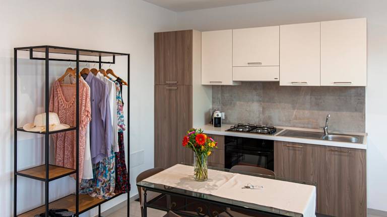 Die Ferienwohnung umfasst ein Schlafzimmer und ein Wohnzimmer sowie eine voll ausgestattete Küche mit Kühlschrank und Kaffeemaschine. Das Badezimmer ist mit einer Dusche und einem Haartrockner ausgestattet. Handtücher und Bettwäsche werden bereitgestellt.